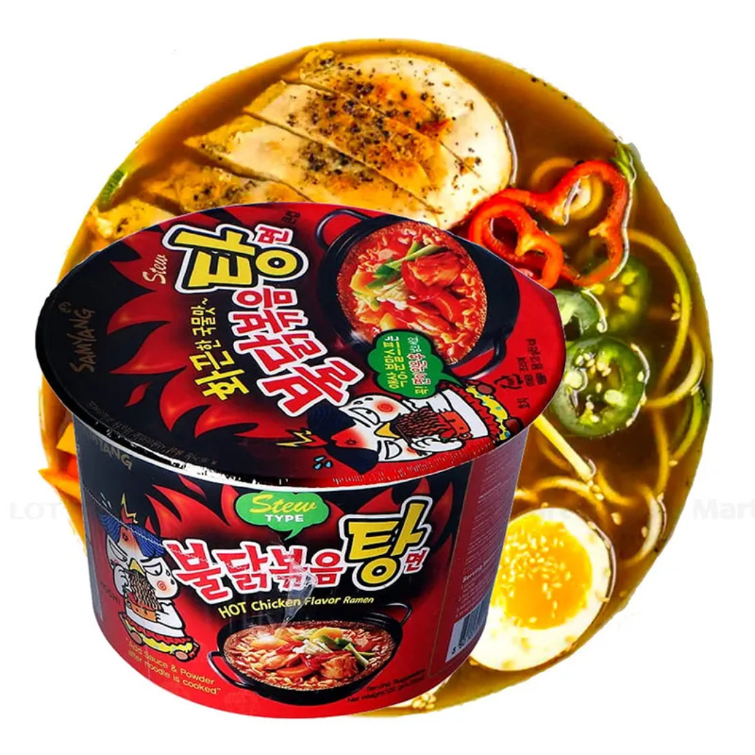 Découvrez la version Big Bowl du célèbre ramen coréen Samyang Hot Chicken, au goût intense et épicé qui a conquis les réseaux sociaux 🌶️🔥. Cette recette “Stew Type” offre une texture plus généreuse et une sauce relevée au poulet épicé, parfaite pour les amateurs de saveurs corsées.